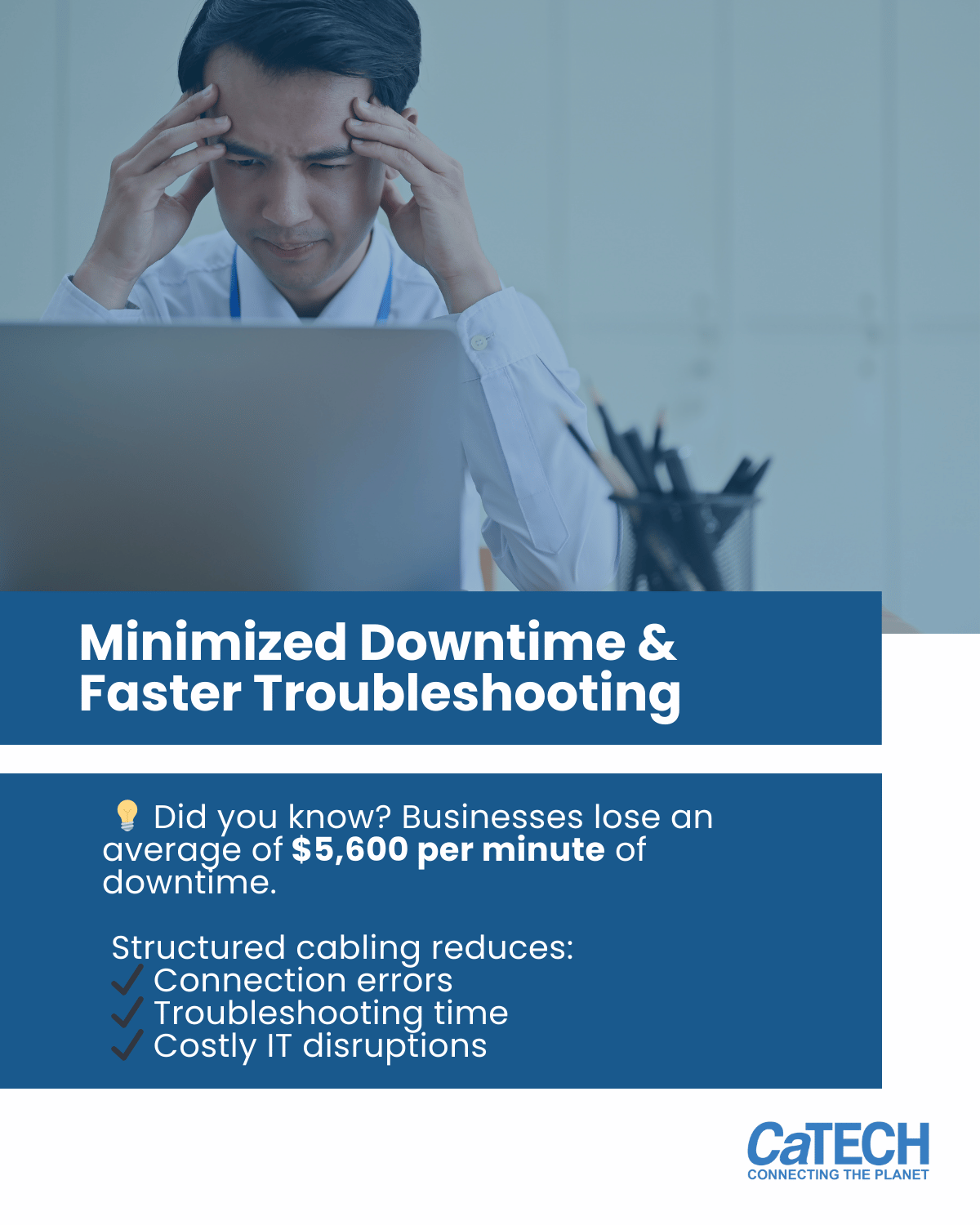 Studies show that companies lose an average of $5,600 per minute of downtime . A structured network prevents unexpected outages and keeps operations running smoothly .